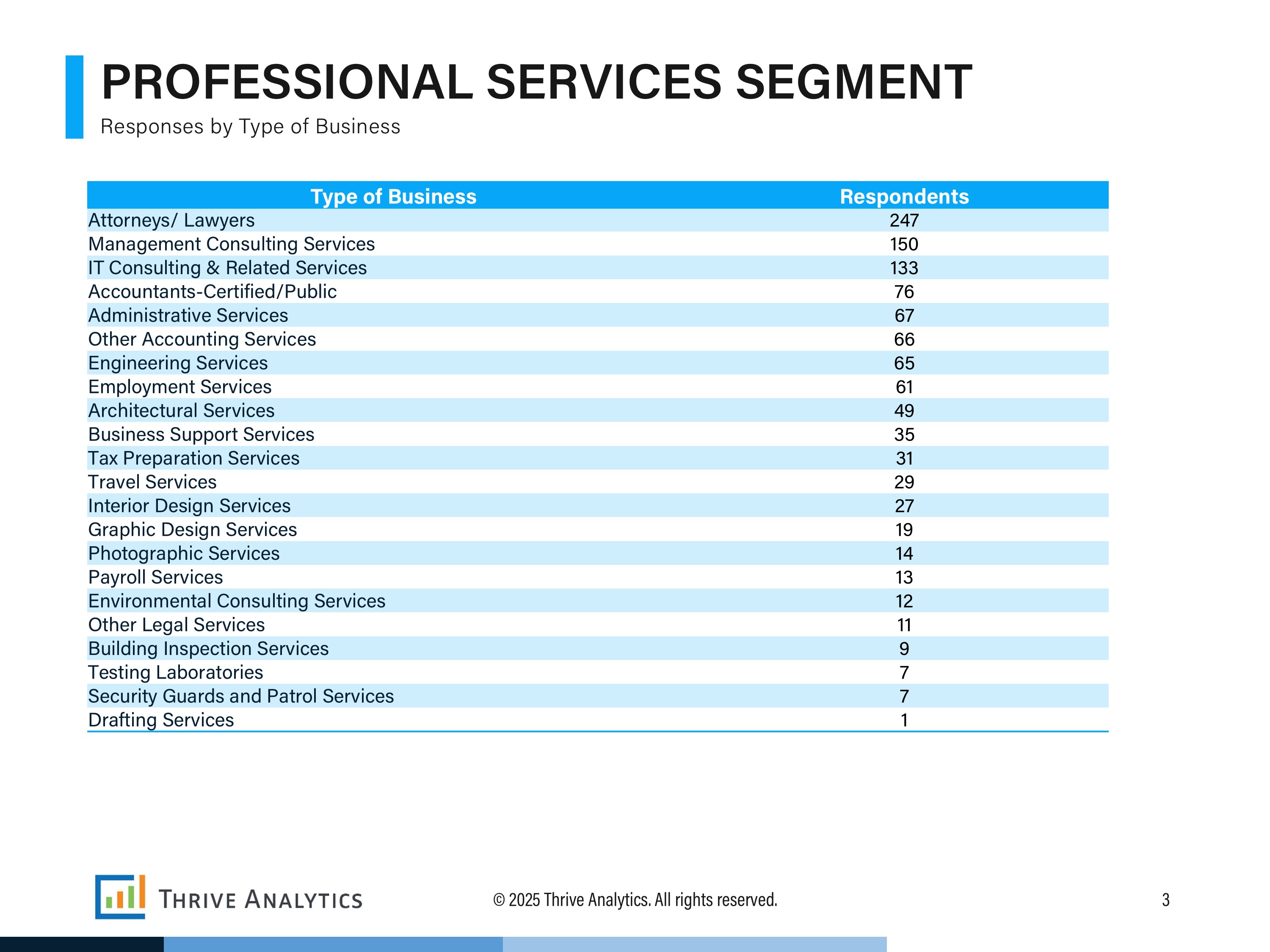 This report is over 60+ pages with 40+ charts. Each section is designed to provide a thorough understanding of the various aspects of operating within the professional services industry from a small business perspective. This comprehensive approach ensures that you, as a vendor or service provider, are well-equipped to meet the needs of your small business customers effectively.